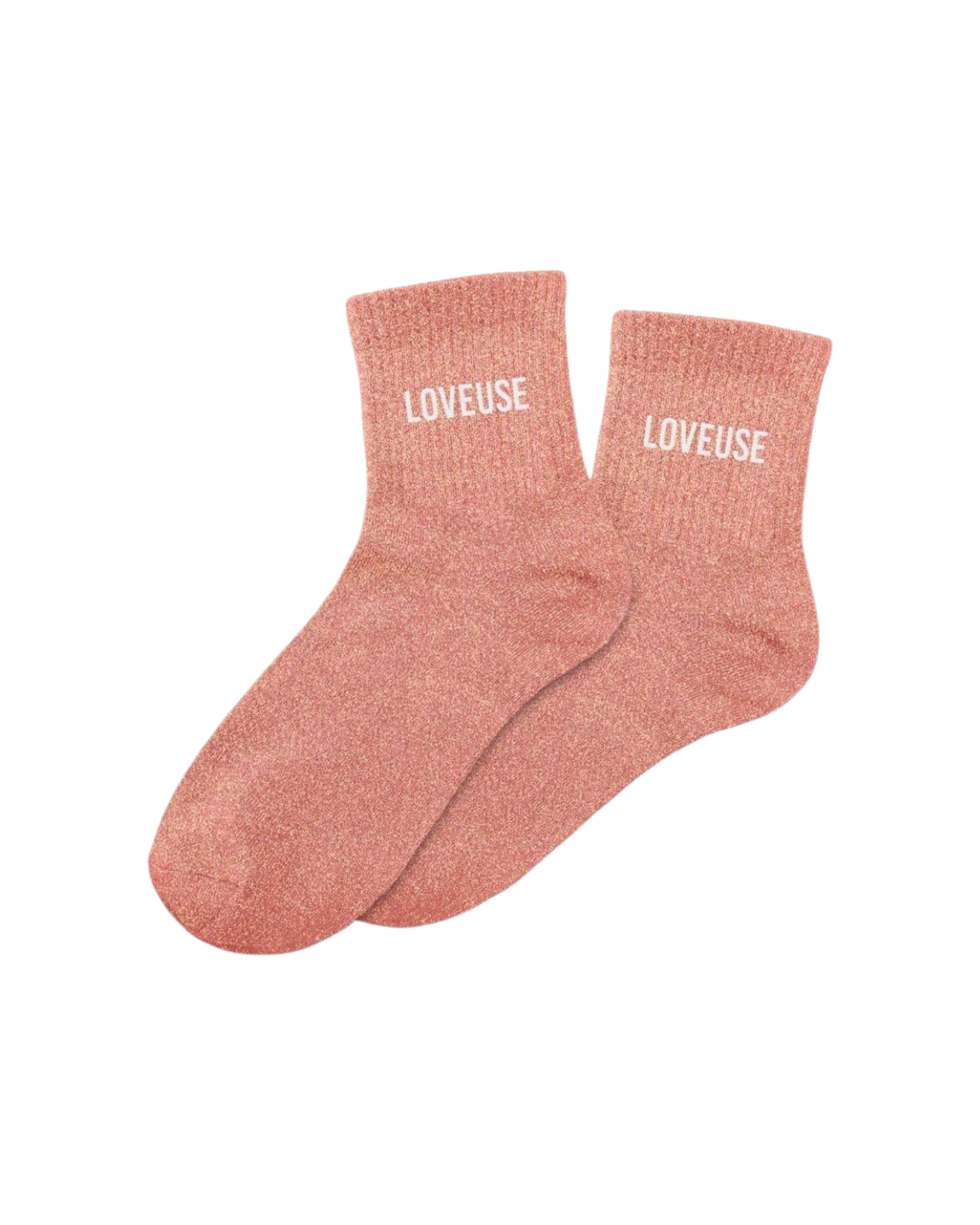 Les chaussettes “Loveuse” célèbrent la douceur et la bienveillance avec leur maille rose poudrée scintillante et leur inscription pleine d’amour. Un modèle délicat et lumineux, parfait pour celles qui répandent de la tendresse à chaque pas.