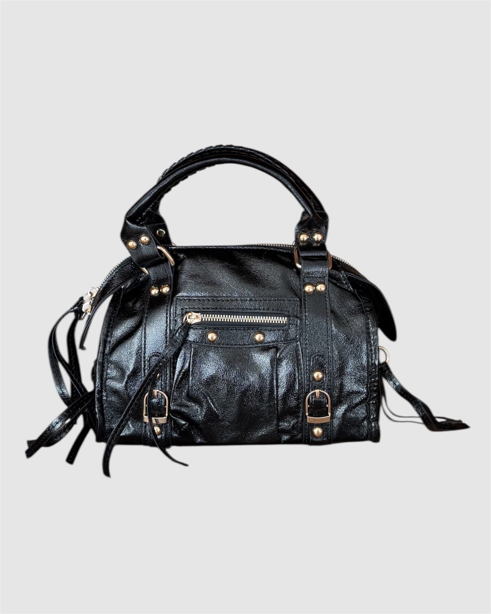 Craquez pour ce sac au fini irisé sophistiqué, parfait pour sublimer toutes vos tenues, de jour comme de nuit. Confectionné dans une matière souple à l’aspect métallisé, il séduit par son design structuré et ses détails raffinés : anses travaillées, rivets dorés, poches zippées et liens décoratifs sur les côtés.