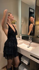 Cette robe courte à sequins est parfaite pour toutes les occasions festives. Son décolleté plongeant, son dos nu et ses volants superposés créent une silhouette élégante, féminine et très lumineuse. La matière pailletée accroche subtilement la lumière, pour un rendu chic sans excès.