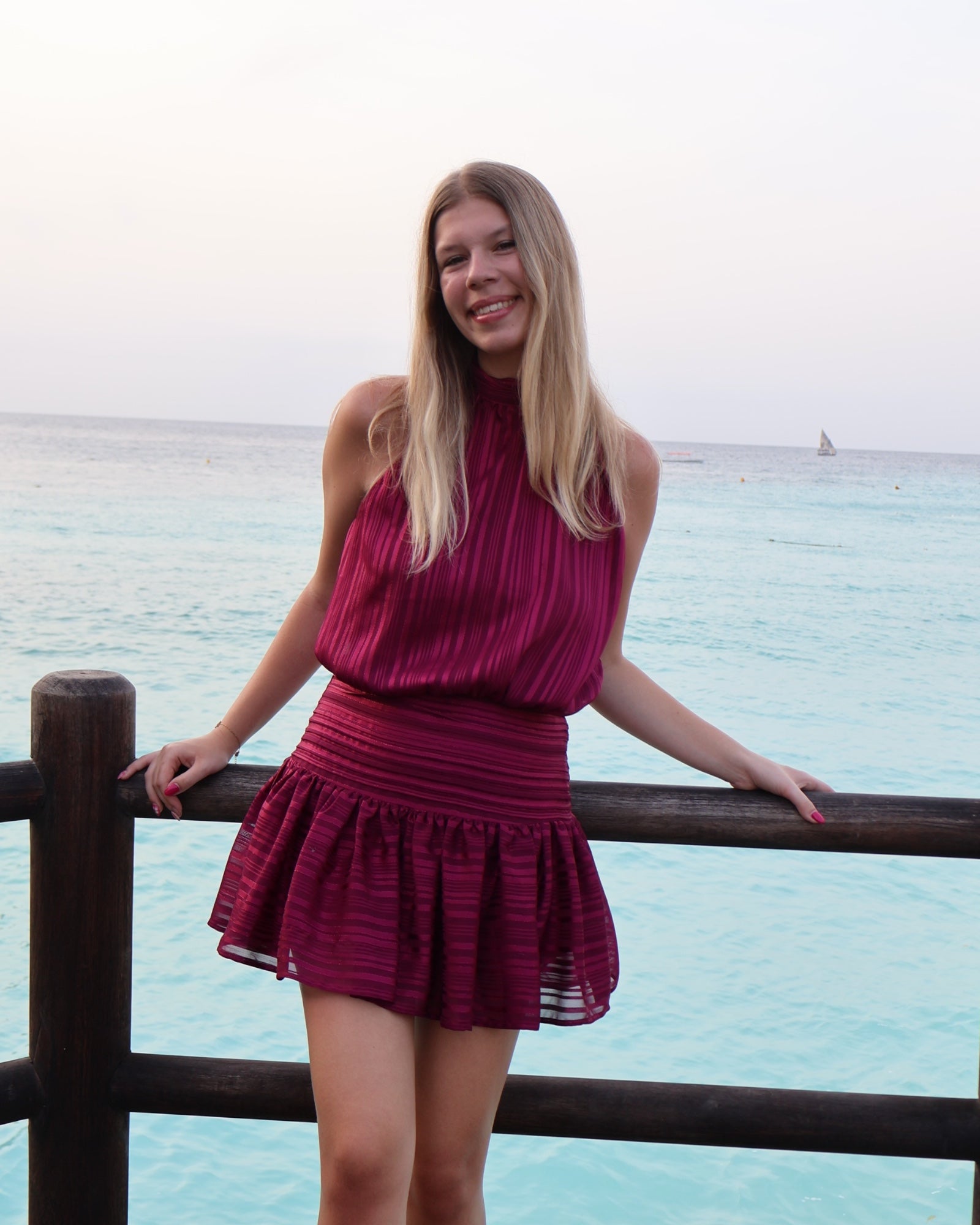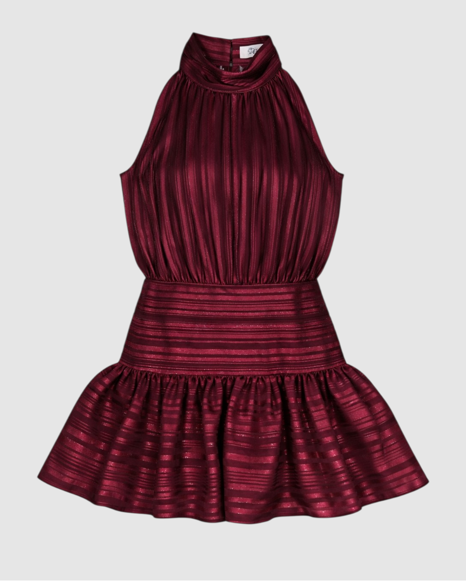 Élégante et intensément féminine, cette robe courte bordeaux sublime la silhouette avec raffinement. Son col montant apporte une touche sophistiquée tandis que le haut légèrement blousant crée un volume fluide et aérien.