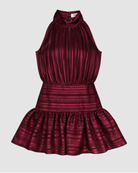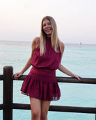 La taille est marquée par une large ceinture smockée qui structure la coupe et souligne délicatement la silhouette. La jupe courte à volants apporte du mouvement et une note romantique, idéale pour une allure chic en toute occasion. Son jeu de fines rayures ton sur ton ajoute du relief et une finition subtilement travaillée.