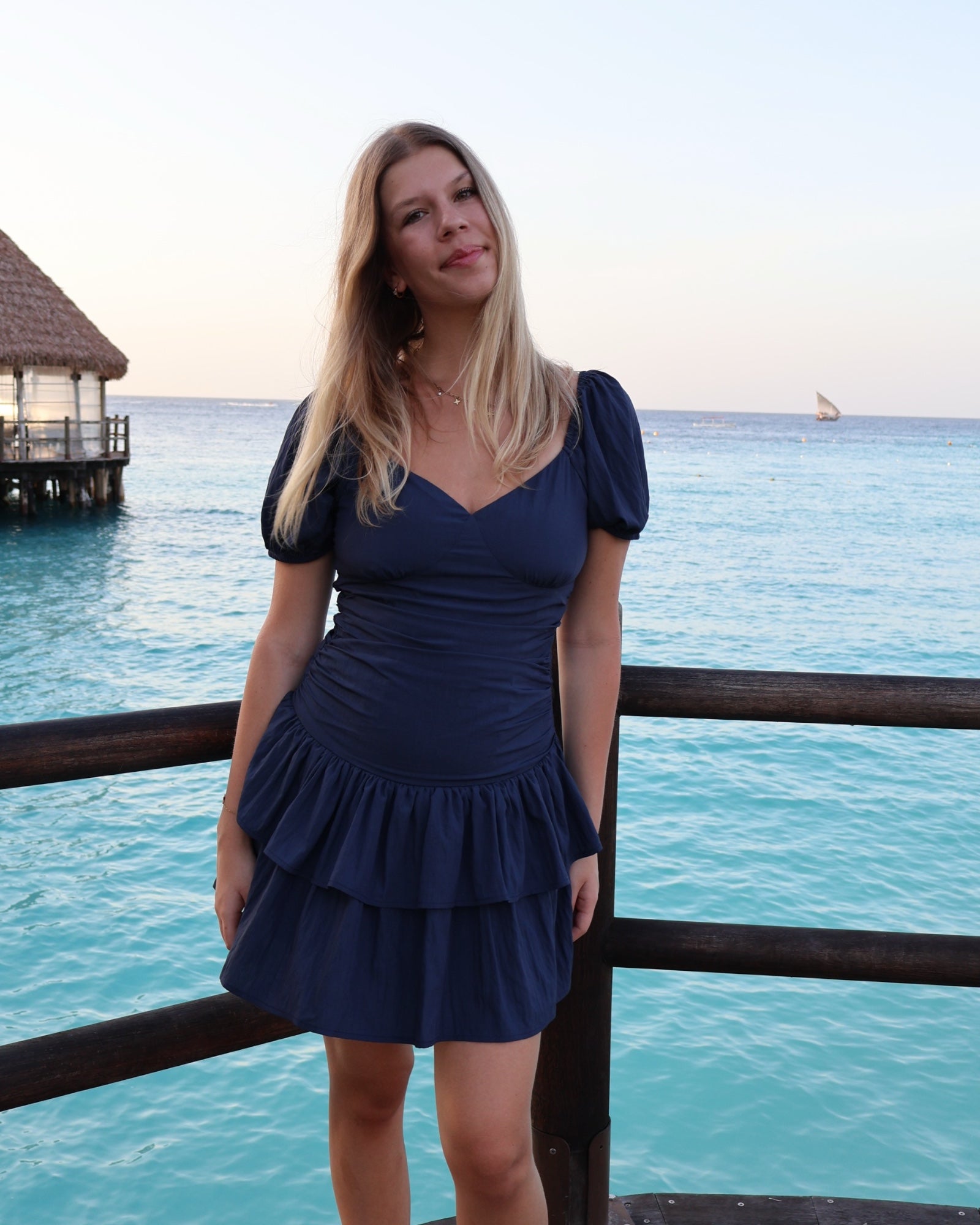 La taille est marquée par un effet froncé qui structure la robe et met en valeur les courbes avec subtilité. Sa jupe à double volant offre un joli mouvement et un tombé fluide, pour une allure à la fois légère et sophistiquée.