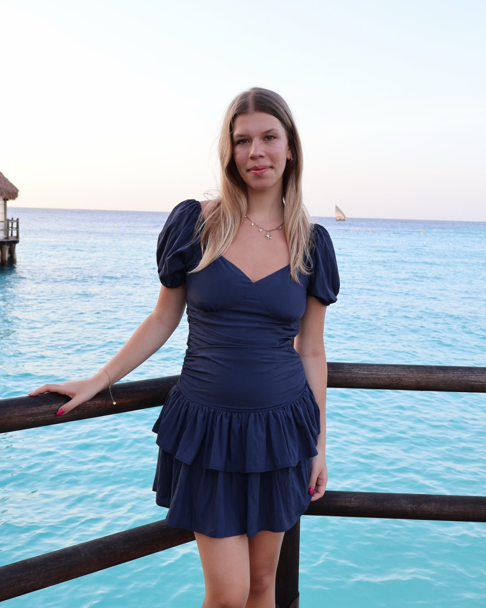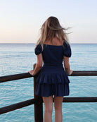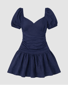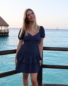 Chic et féminine, cette robe courte bleu navy séduit par sa coupe flatteuse et son élégance intemporelle. Son décolleté en V sublime délicatement la silhouette, tandis que ses manches courtes légèrement bouffantes apportent une touche moderne et raffinée.