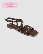 Sandales plates au caractère affirmé, sublimées par de délicats clous dorés qui captent la lumière avec audace.