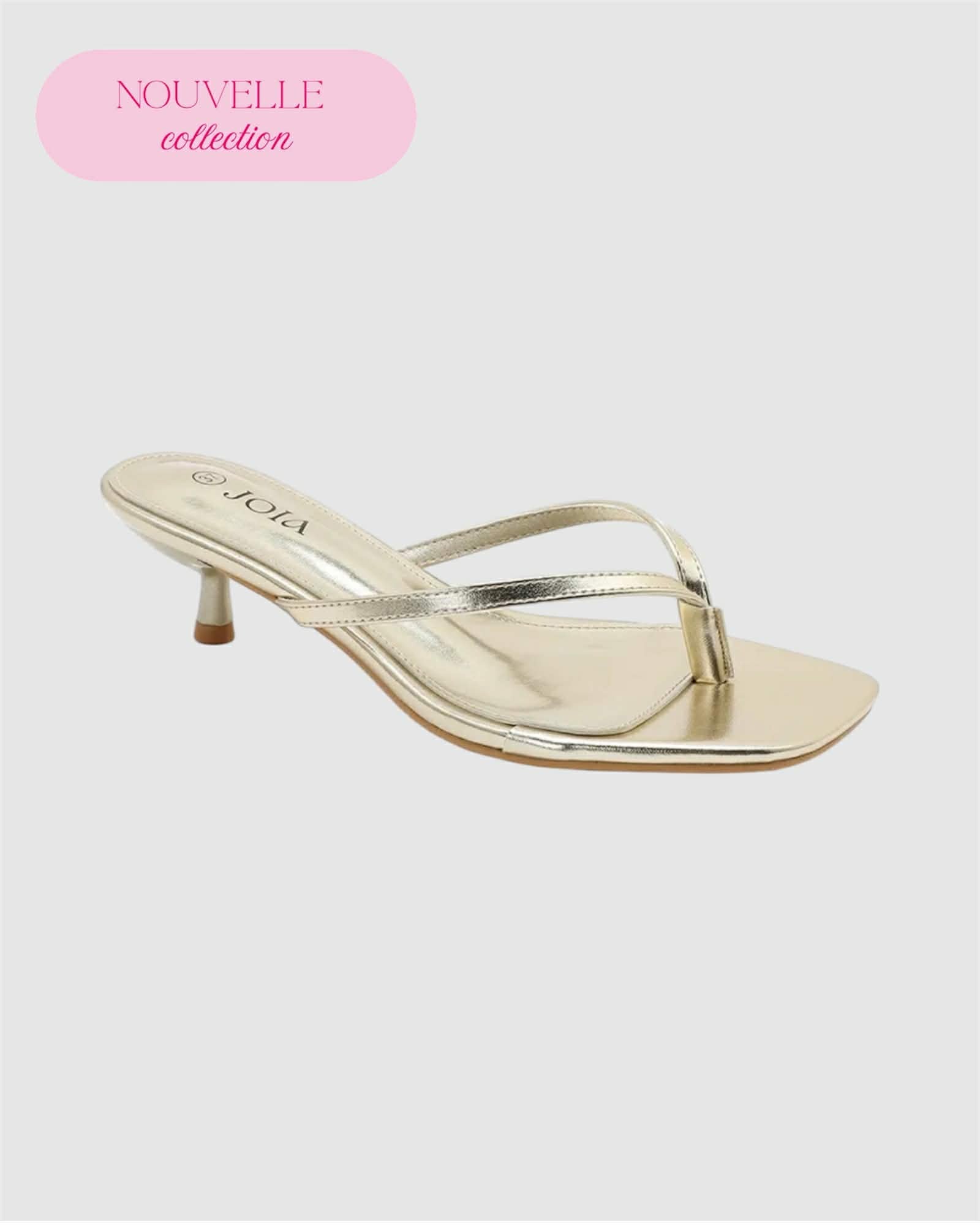 Sandales mules dorées à talon, au design délicatement épuré, qui captent la lumière à chaque pas.