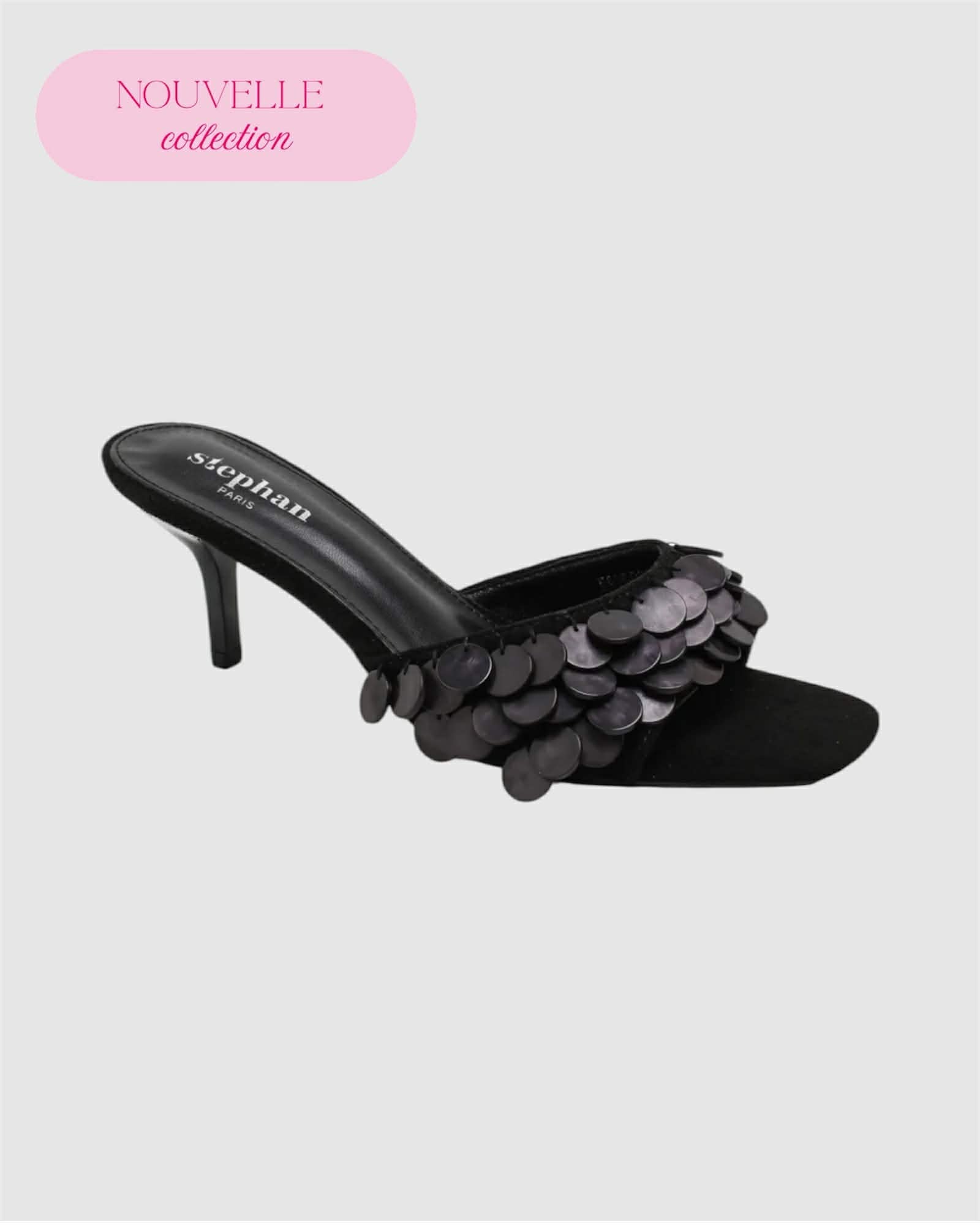 Mules à talon au style audacieux, sublimées par une cascade de pastilles brillantes qui captent la lumière avec élégance.
