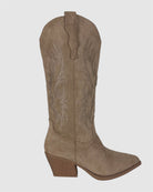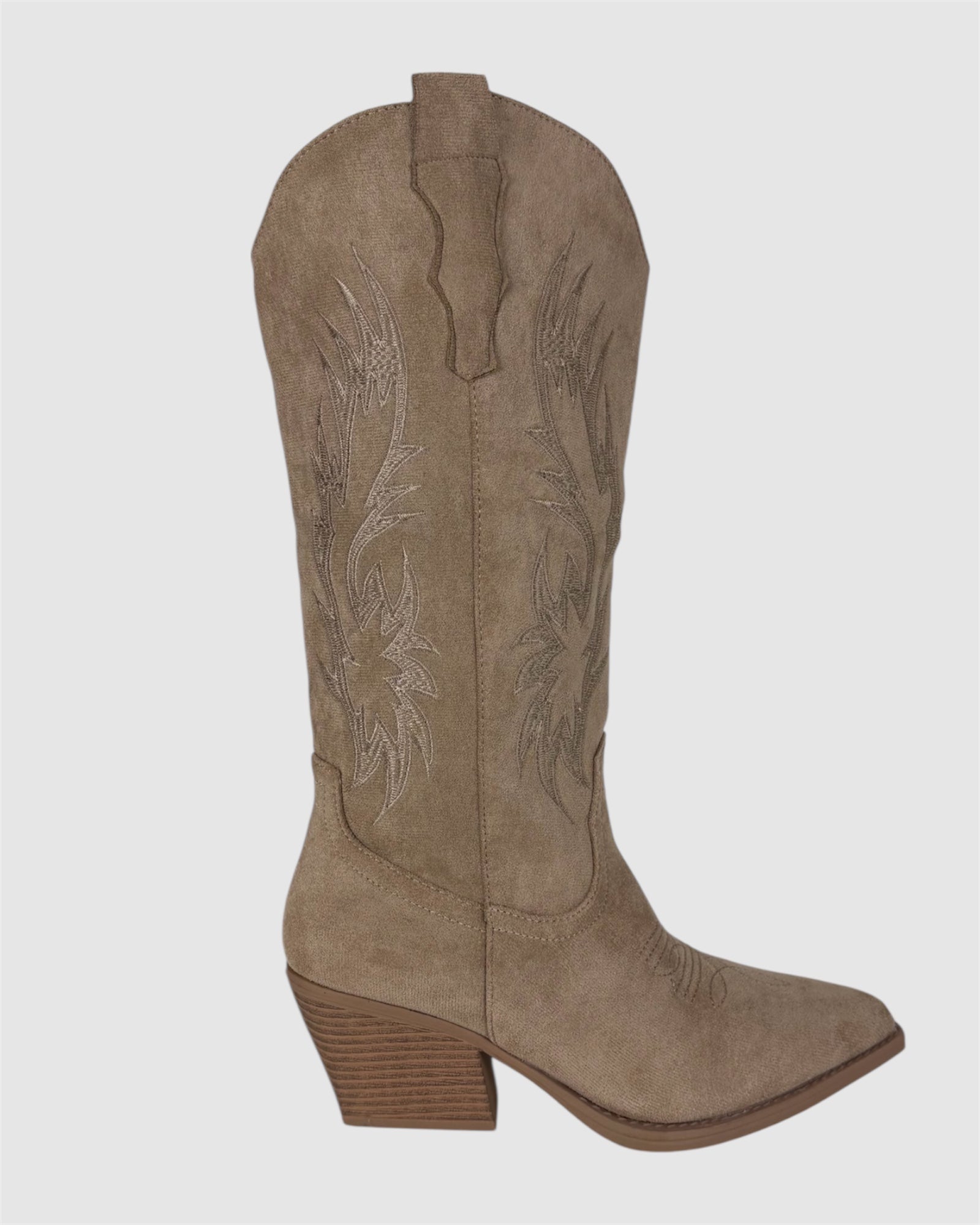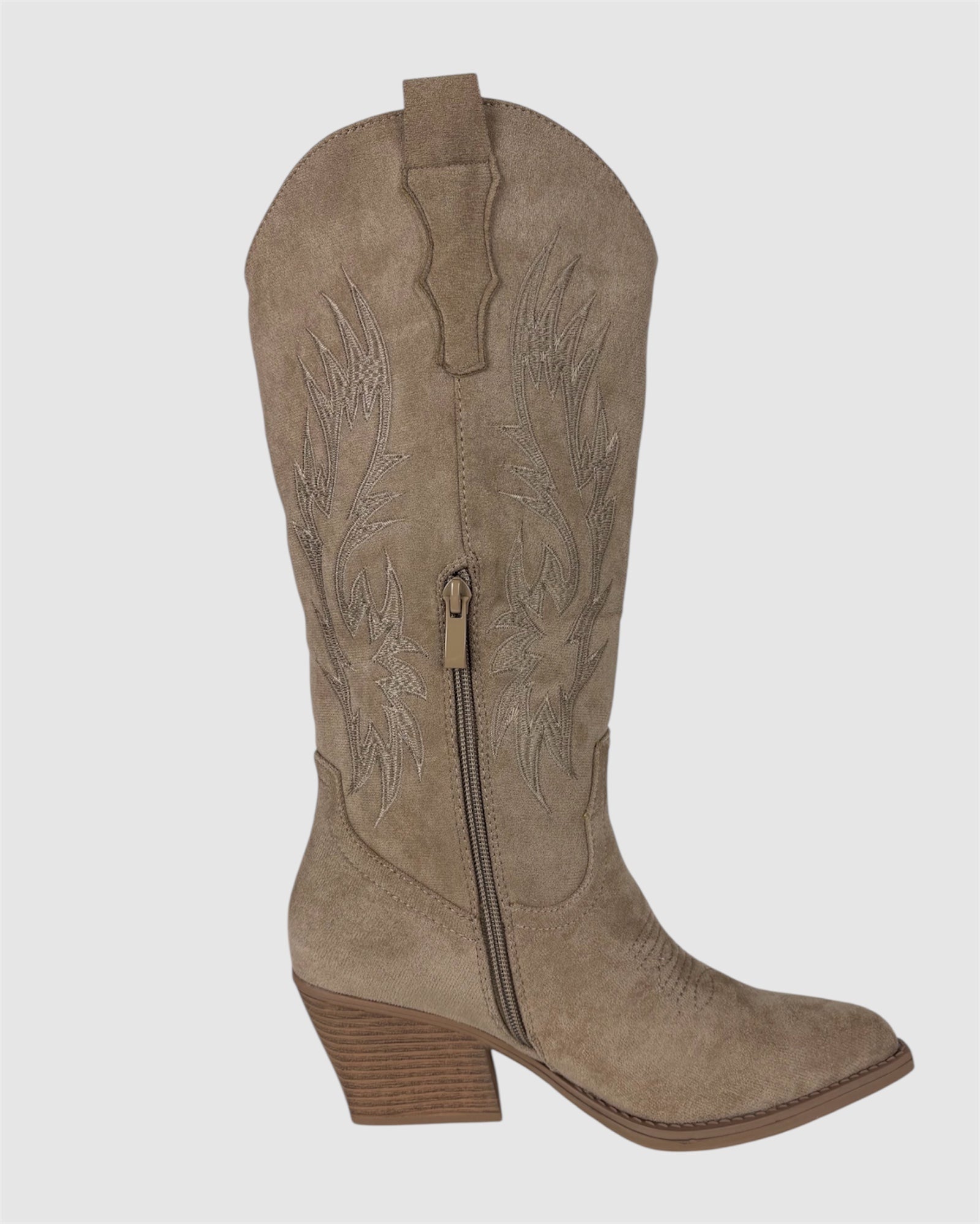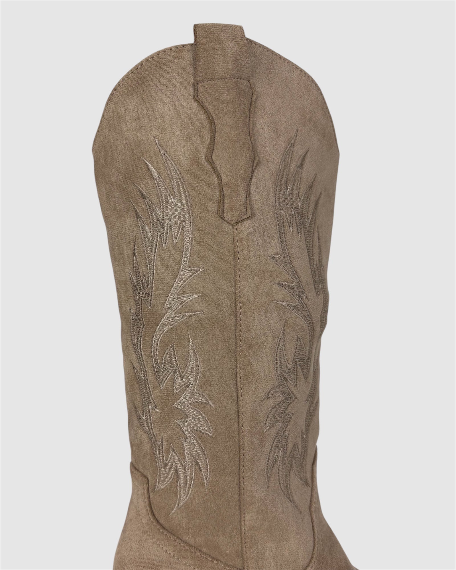 Laissez-vous séduire par ces bottes western en suédine beige taupe, un indispensable de la saison pour un look bohème et tendance. Leur matière douce effet daim et leurs broderies décoratives ton sur ton leur confèrent un style authentique et raffiné.