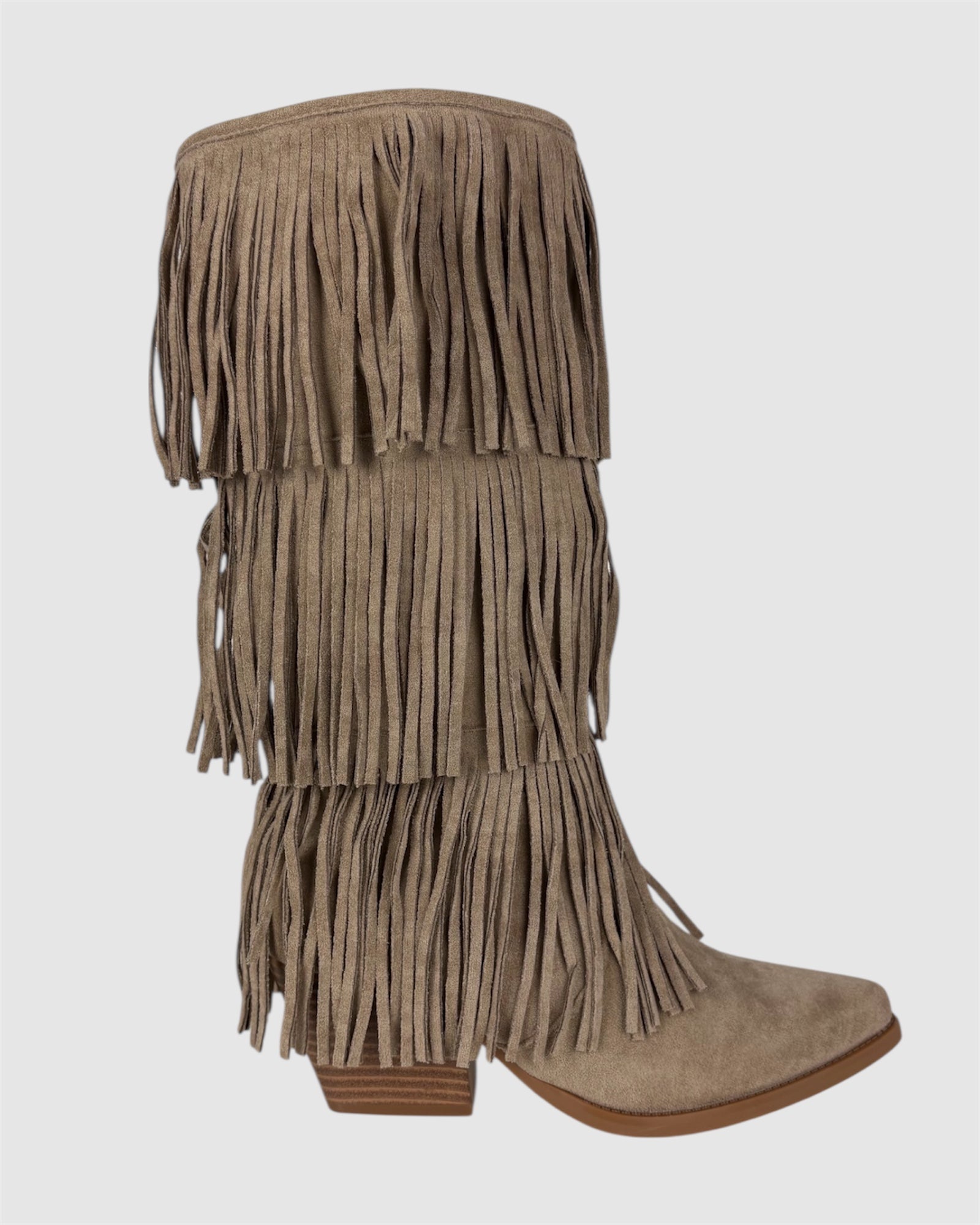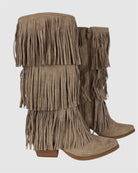 Misez sur un style bohème affirmé avec ces bottes western à franges en suédine taupe. Leur design audacieux à plusieurs niveaux de franges apporte du mouvement et de la légèreté à votre look, tout en conservant une allure chic et tendance.