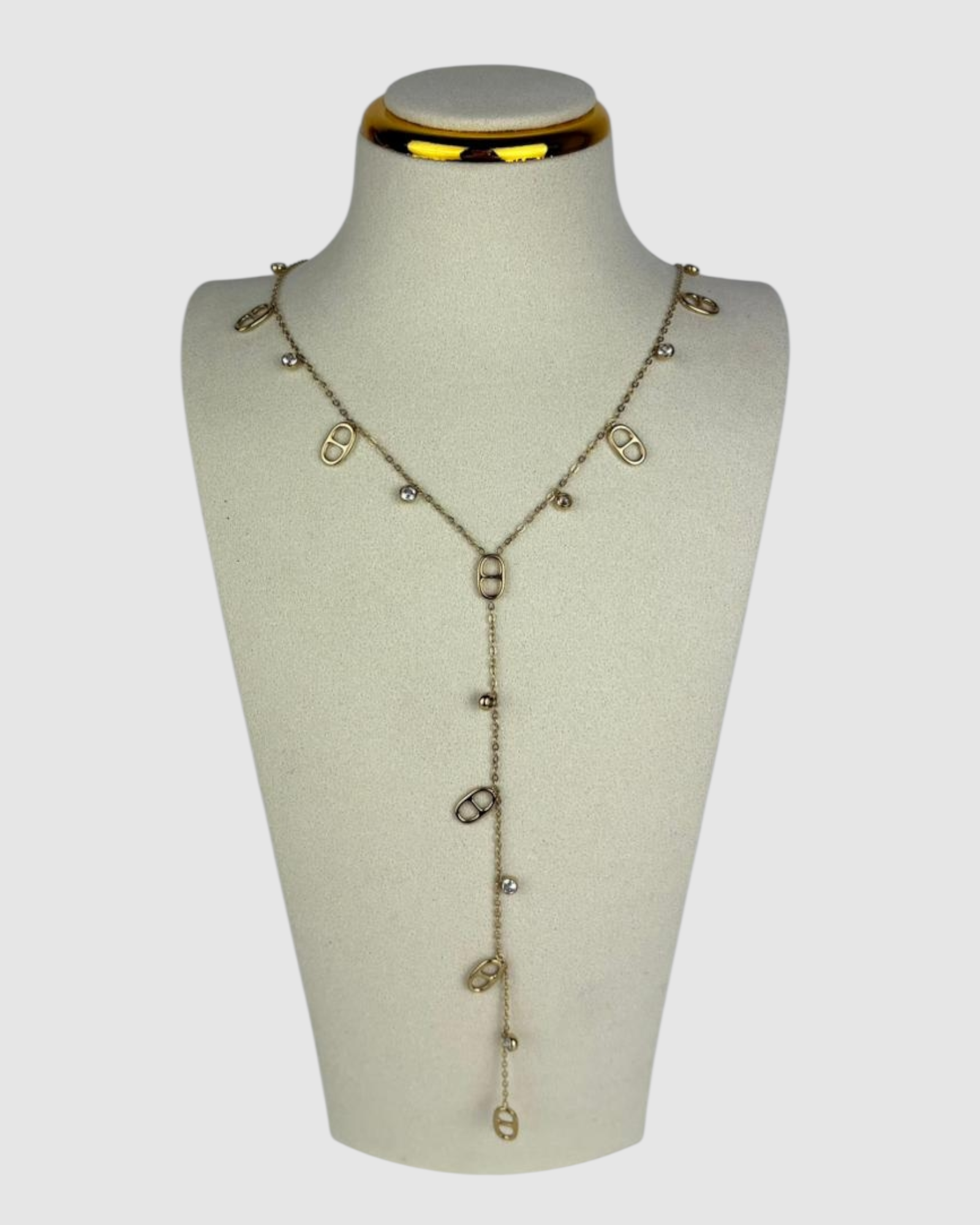 Élégant et audacieux, ce collier en acier inoxydable se distingue par son design original composé de maillons façon « languettes » délicatement répartis le long de la chaîne. Sa forme en Y apporte une touche raffinée et allonge le décolleté, tandis que les petites perles métalliques ajoutent une note subtile de brillance.