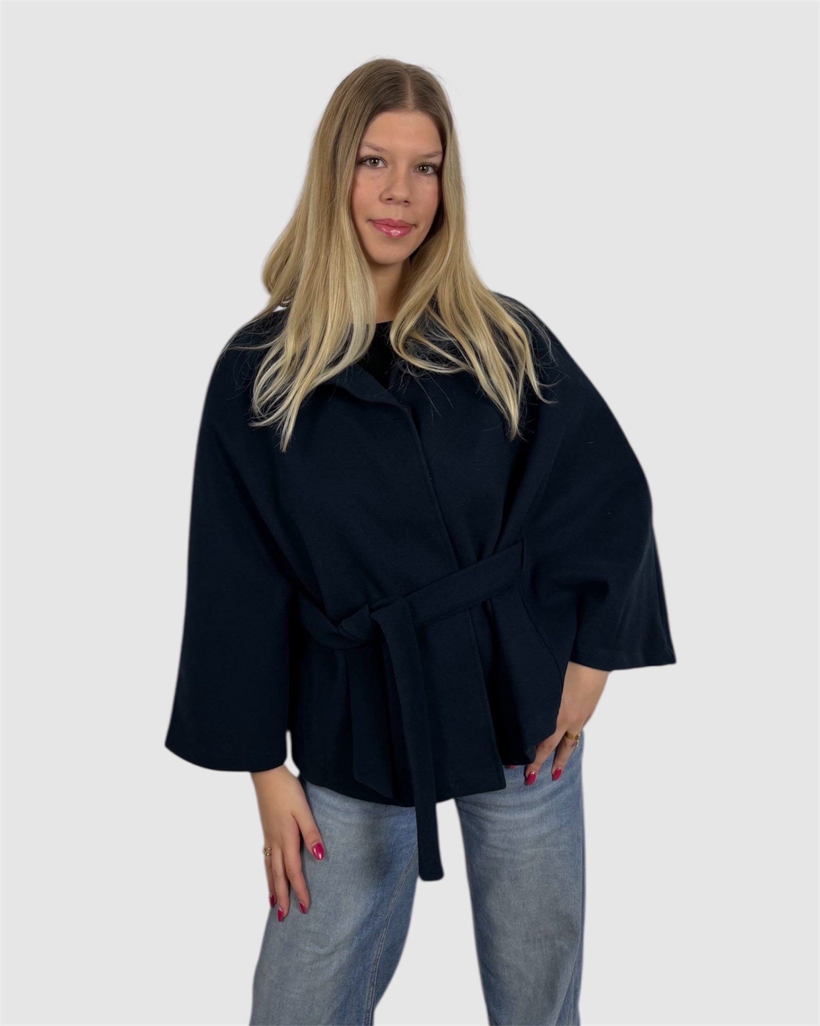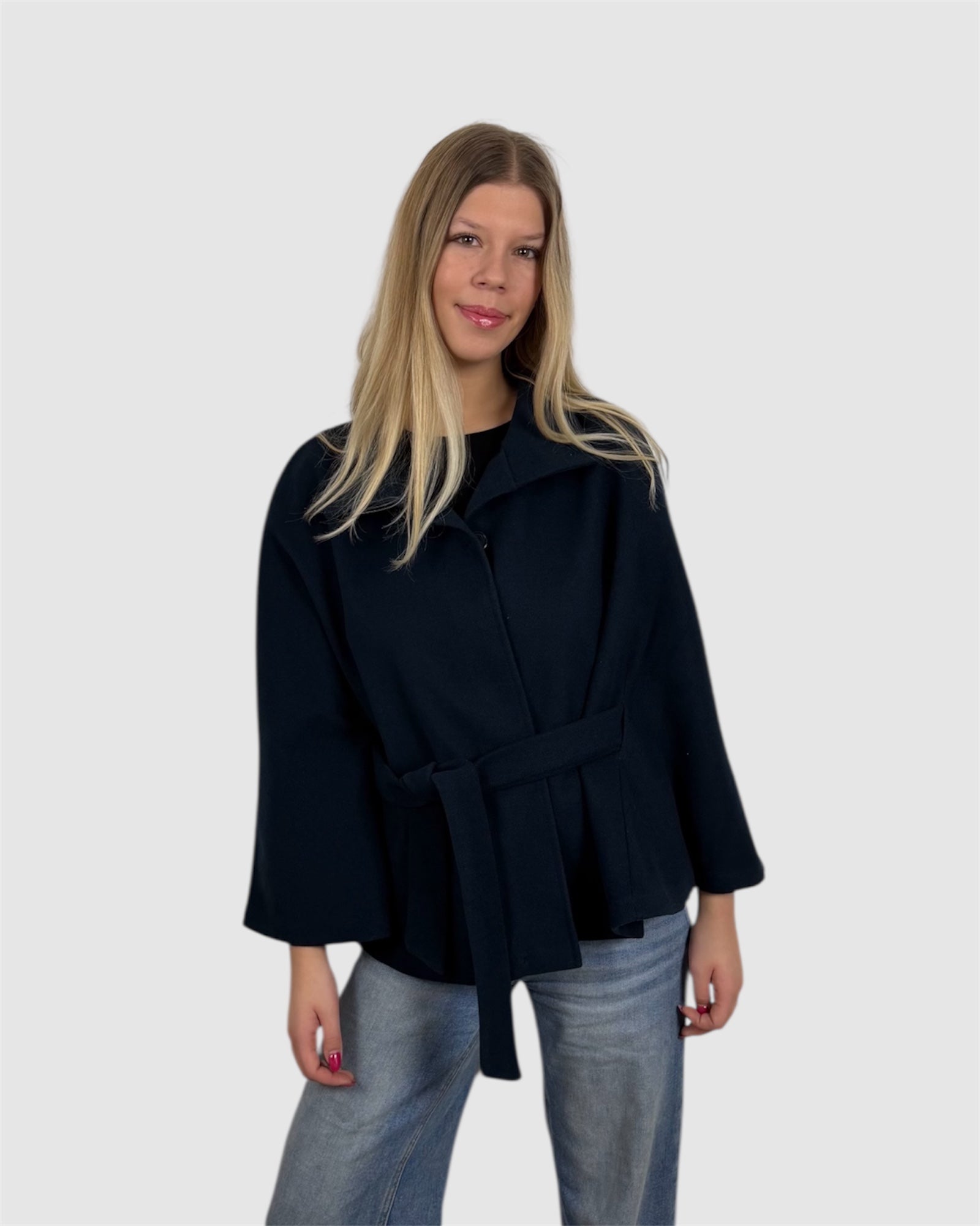Cape élégante avec col montant et ceinture à nouer à la taille. Sa coupe fluide et structurée apporte une allure chic et moderne, idéale pour la mi-saison comme pour l’hiver.