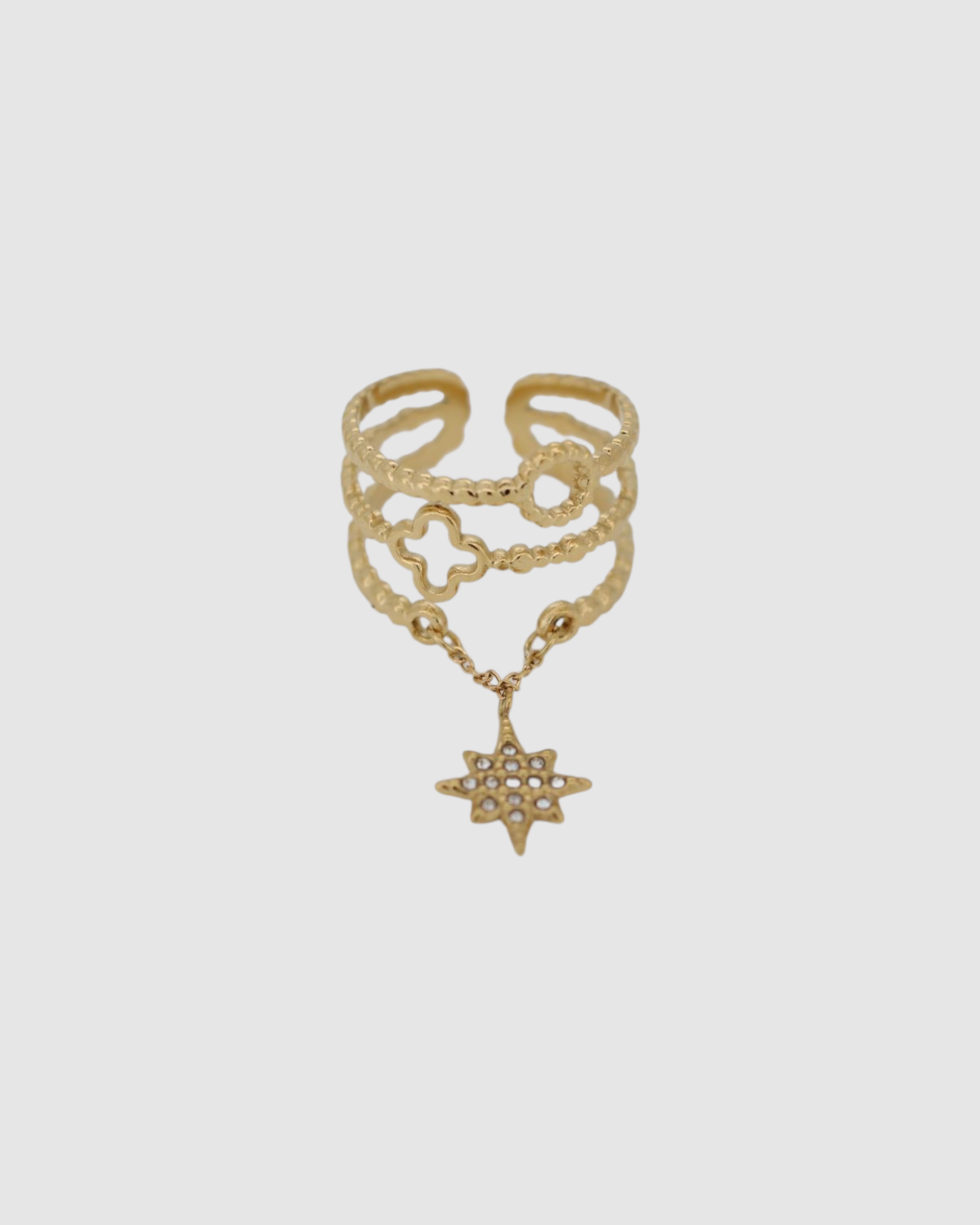 Sophistiquée et moderne, cette bague réglable en acier inoxydable se distingue par son design raffiné composé de trois anneaux finement texturés. Ses motifs délicats, dont une forme trèfle stylisée et un charm pendentif en étoile orné de petites pierres scintillantes, apportent une touche lumineuse et féminine à votre allure.