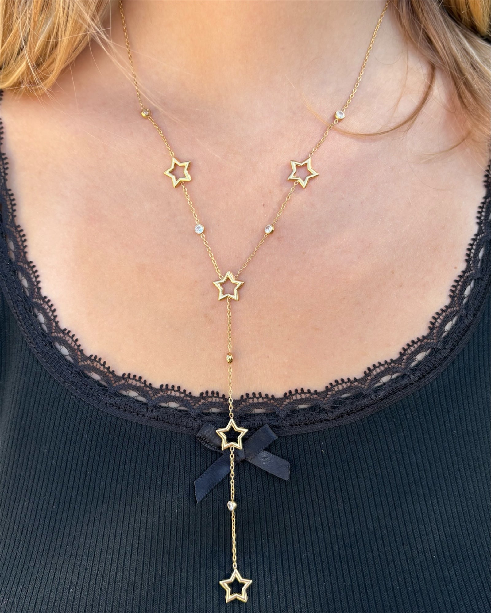Dessiné par SMTZ, ce collier délicat se compose de plusieurs pendentifs en forme d’étoile, subtilement ornés de strass scintillants. Chaque étoile capte la lumière avec élégance et symbolise l’audace et la féminité de la SMTZ girl.