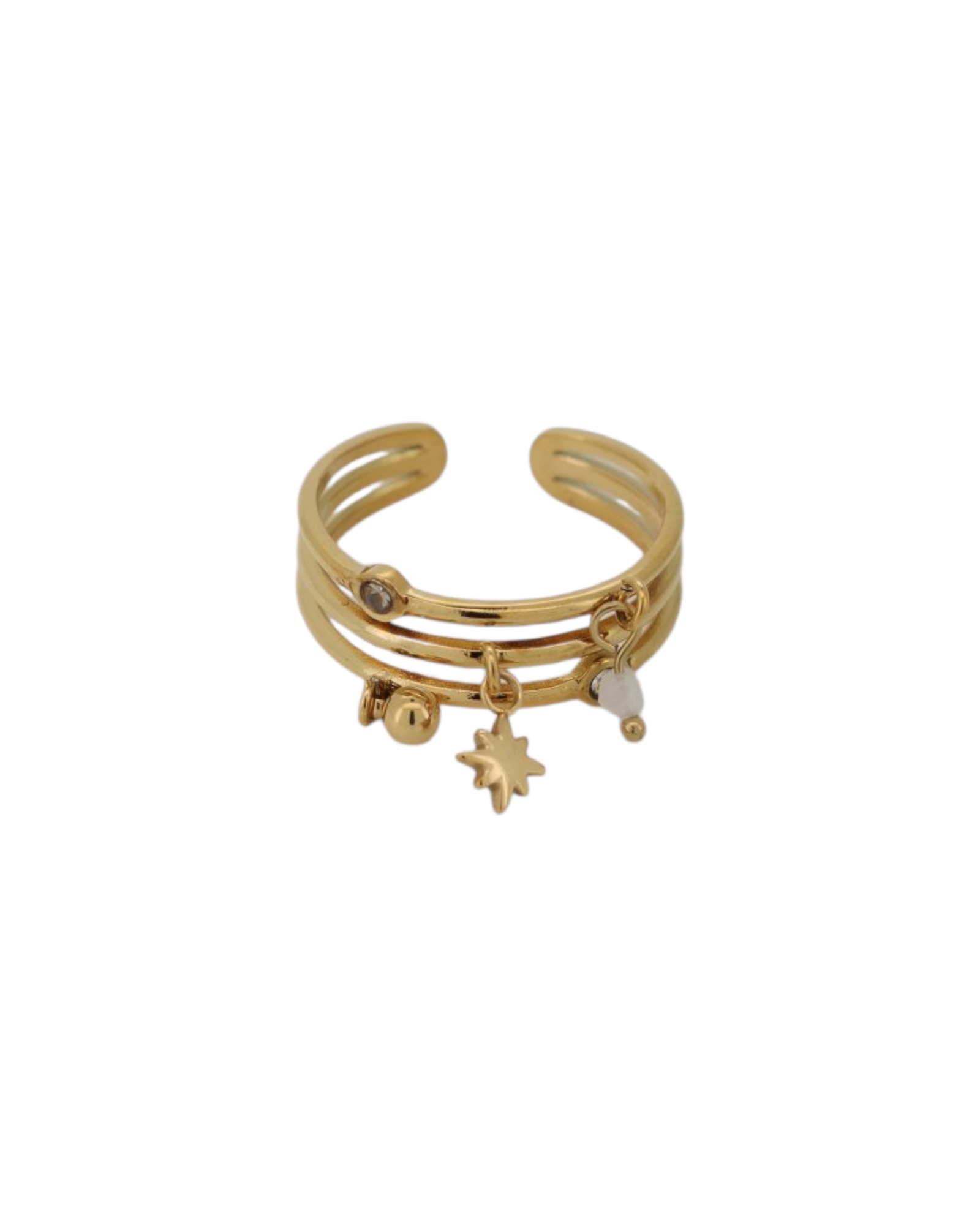 Originale et raffinée, cette bague multi-rangs en acier inoxydable se distingue par ses trois anneaux fins ornés de petits charms délicats : une étoile, une perle et de subtils détails dorés. Son design structuré et moderne apporte une touche de caractère tout en restant élégant et féminin.