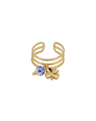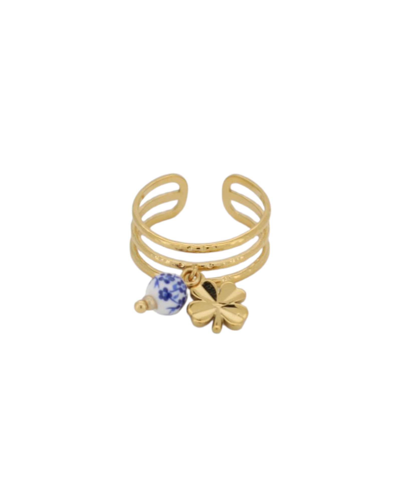 Charmante et originale, cette bague en acier inoxydable se distingue par son design à trois anneaux fins ornés de deux pendentifs : un trèfle porte-bonheur et une perle céramique blanche décorée de motifs bleus. Une combinaison élégante entre symbolique et raffinement, parfaite pour ajouter une touche de gaieté et de style à vos looks.