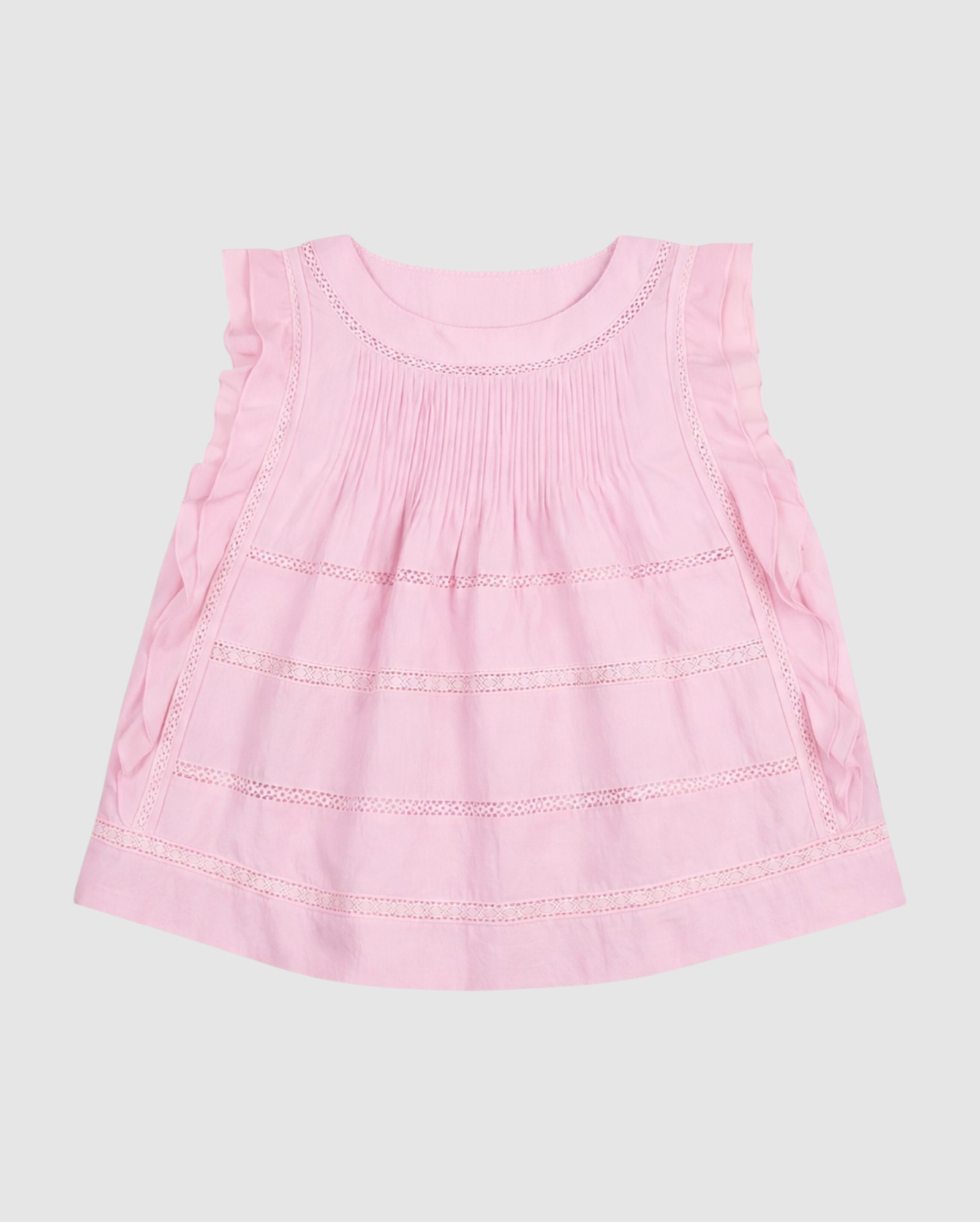 Ce top rose délicat séduit par son style romantique et féminin. Son plastron finement plissé apporte du relief et une touche raffinée, tandis que les détails ajourés et les empiècements délicats subliment la pièce avec élégance. Les manches volantées ajoutent une note légère et aérienne, parfaite pour la saison.