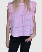 Ce top rose délicat séduit par son style romantique et féminin. Son plastron finement plissé apporte du relief et une touche raffinée, tandis que les détails ajourés et les empiècements délicats subliment la pièce avec élégance. Les manches volantées ajoutent une note légère et aérienne, parfaite pour la saison.