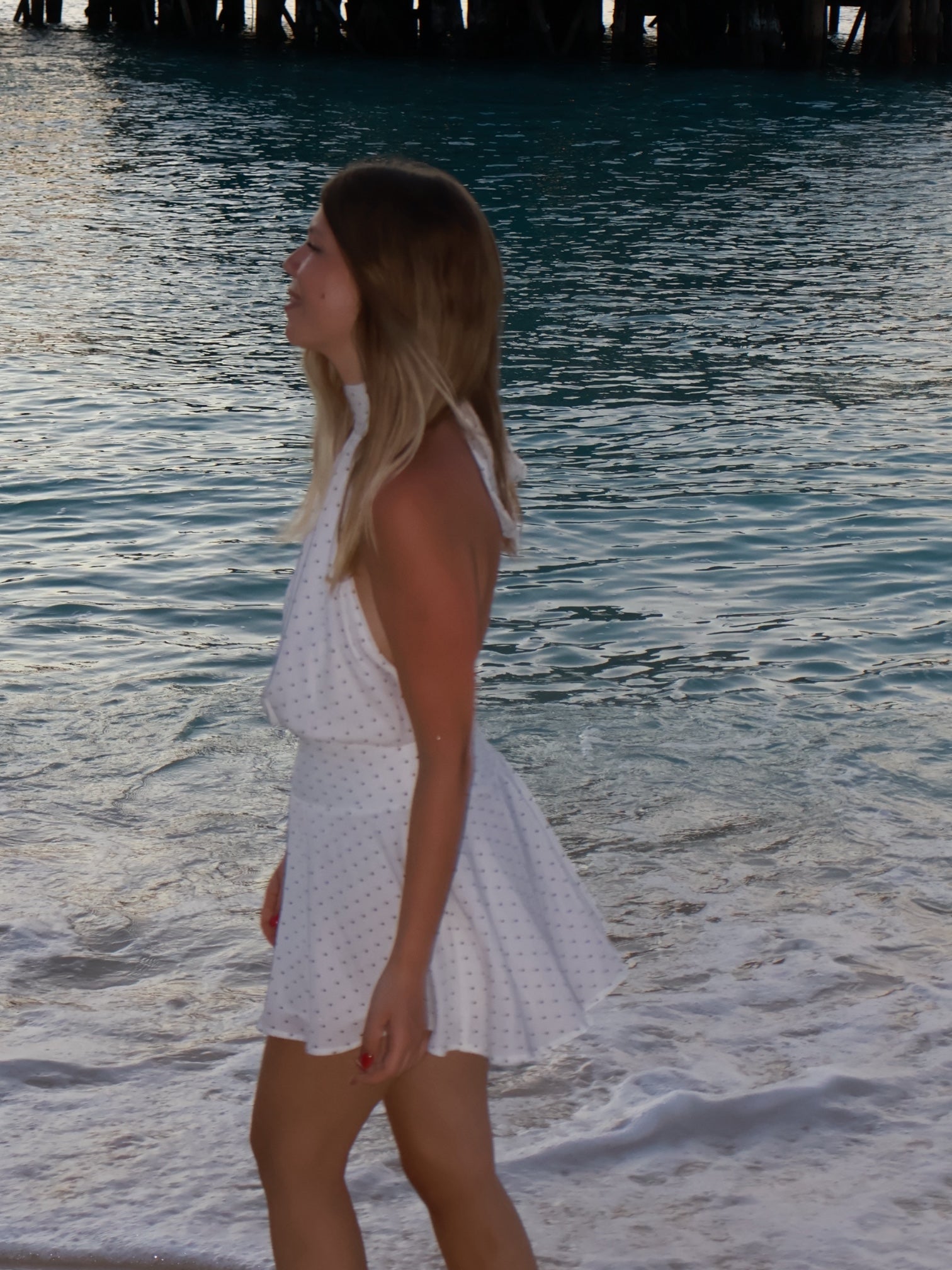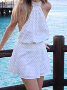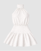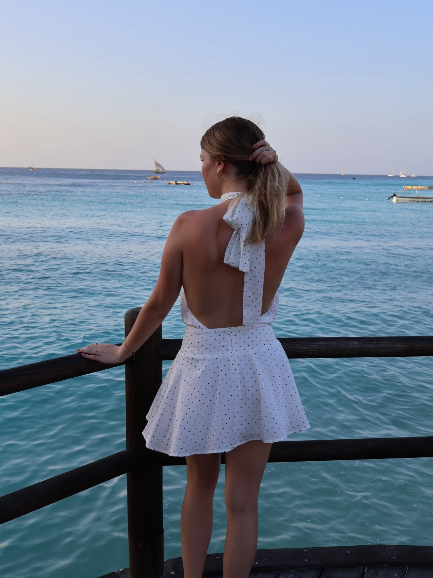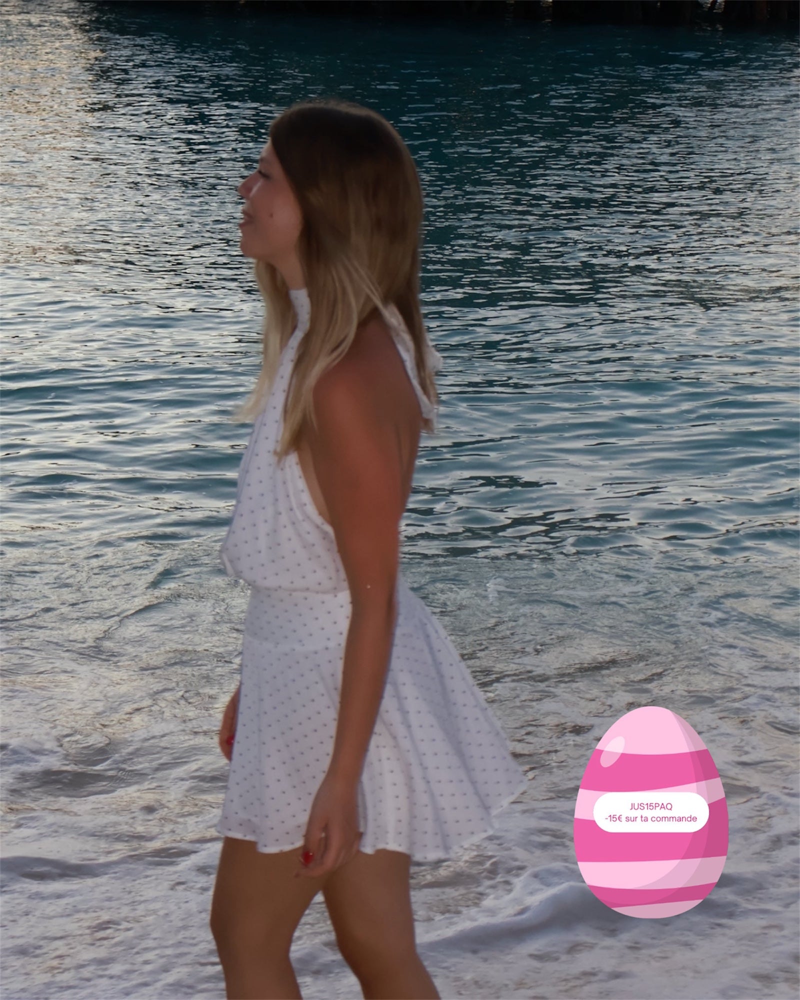 Cette robe courte à pois incarne l’élégance estivale avec une touche rétro chic. Son col halter à nouer derrière la nuque sublime les épaules et révèle un magnifique dos nu, apportant féminité et légèreté. La taille délicatement marquée structure la silhouette tandis que la jupe évasée offre un mouvement fluide et aérien.