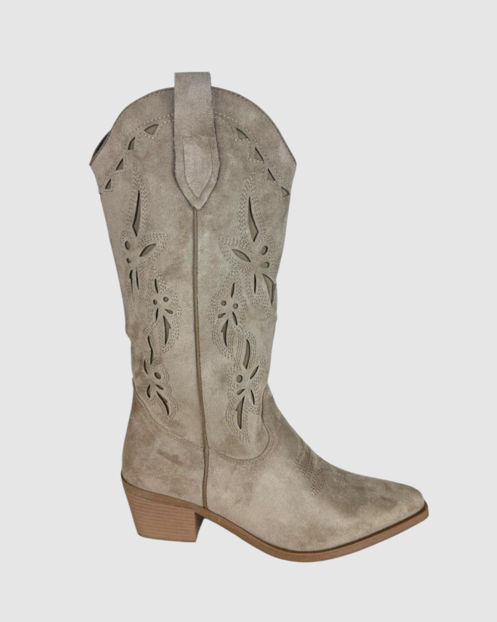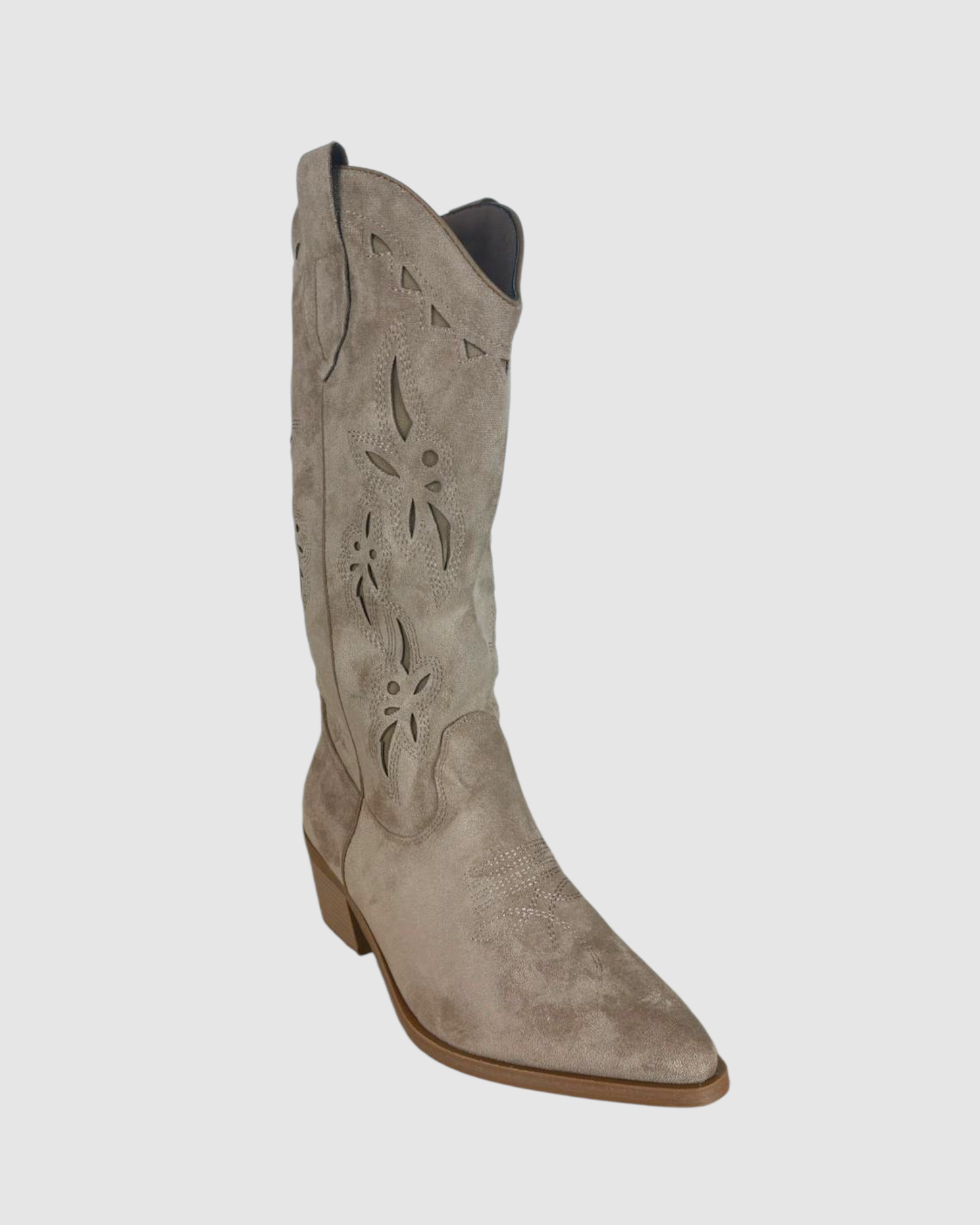 Ces santiags hautes pour femme séduisent par leur style western délicat et intemporel. Confectionnées en suédine beige clair, elles se distinguent par de jolis motifs ajourés effet broderie florale, qui apportent légèreté et féminité à la botte.
